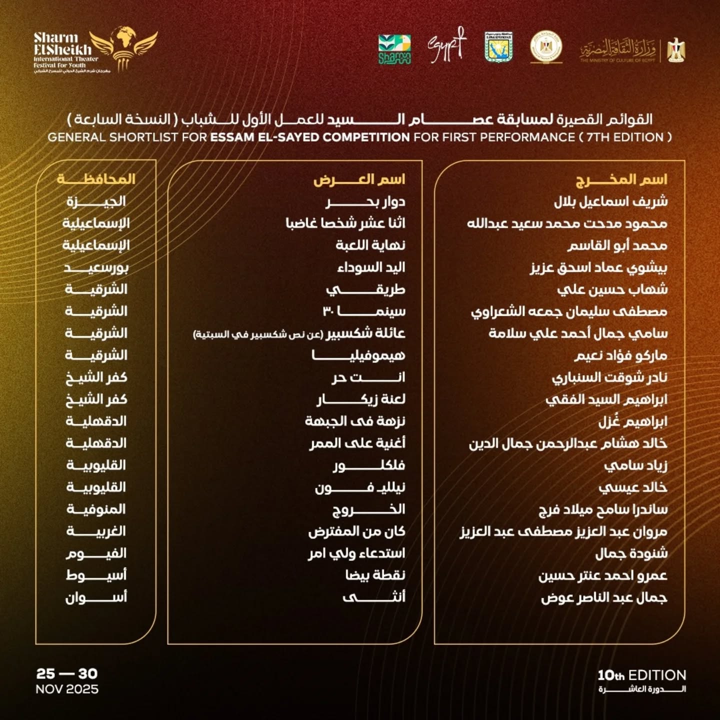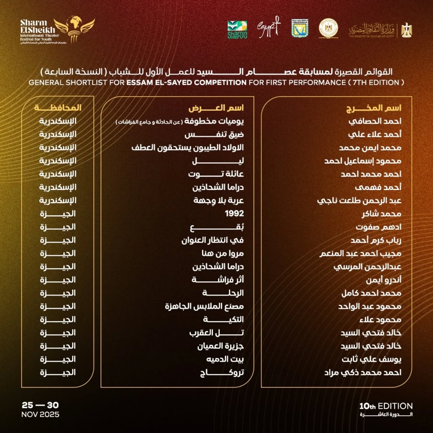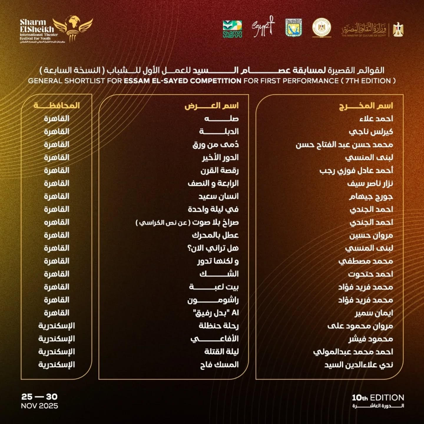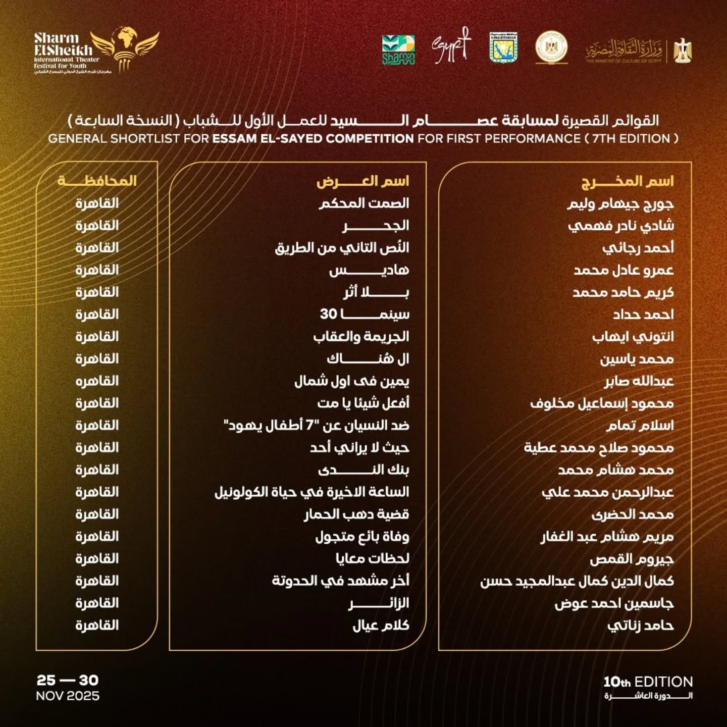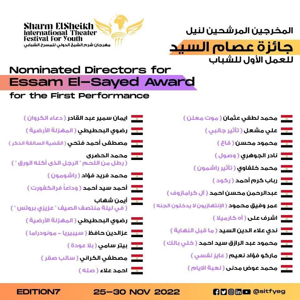 شروط المشاركة في مسابقة جائزة المخرج عصام السيد للمخرجين المسرحيين المصريين أصحاب التجارب الأولى فى مجال الإخراج المسرحى