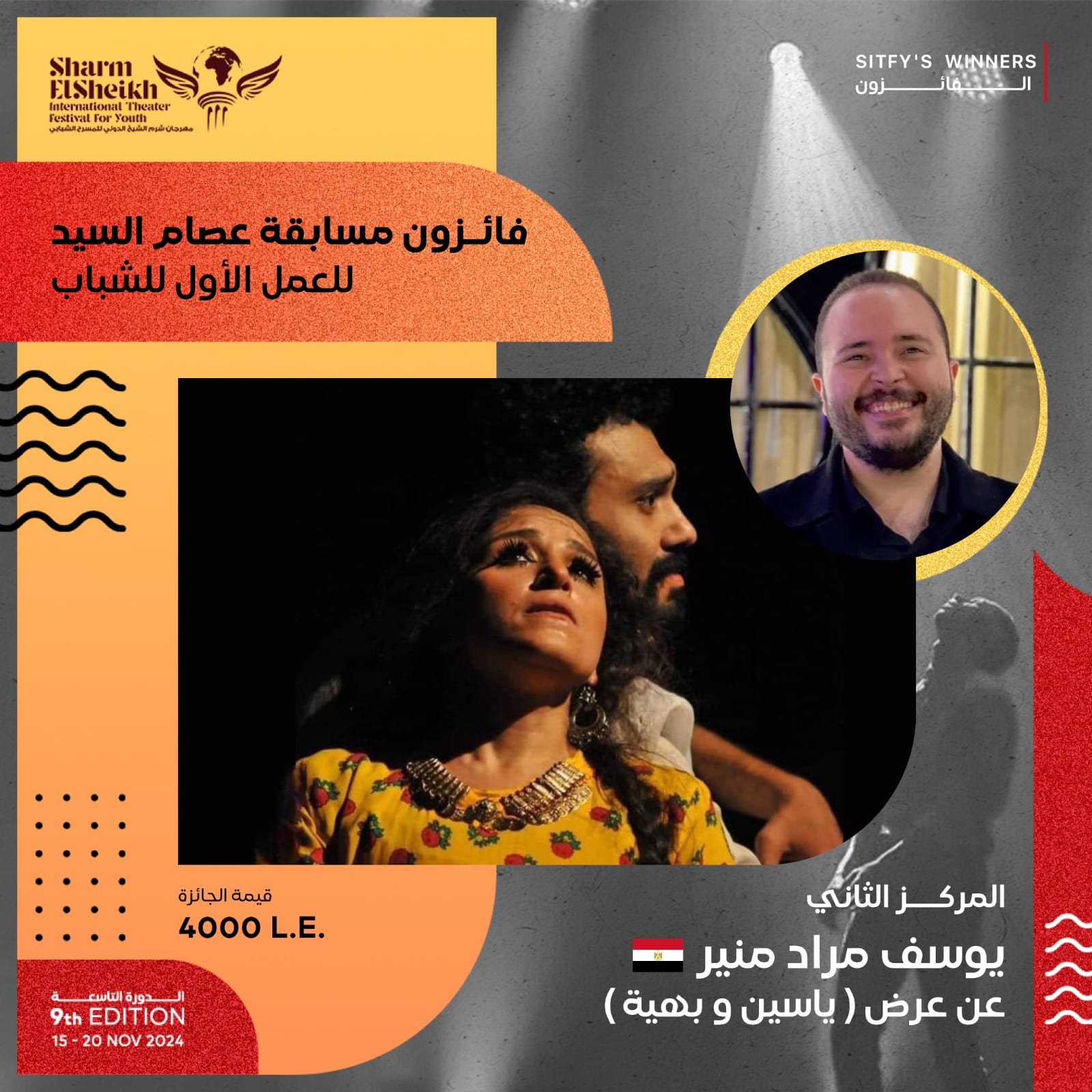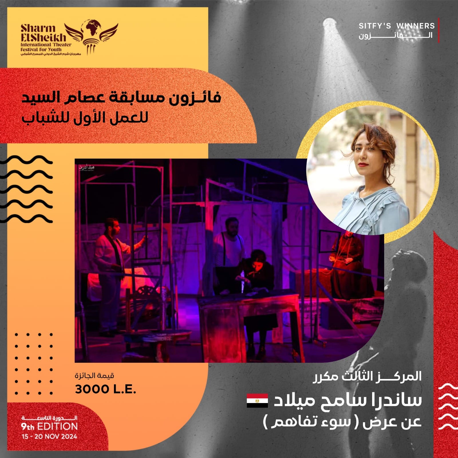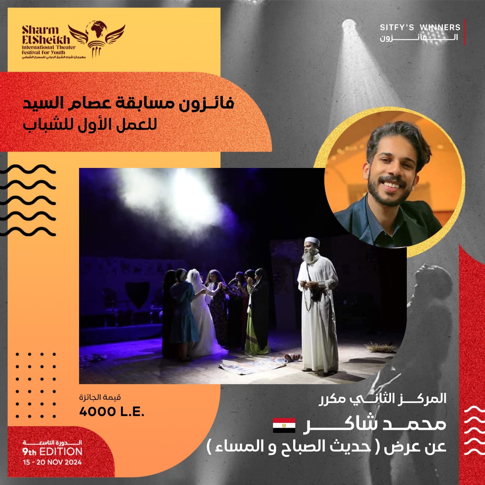 ثلاث جوائز مالية يخصصها المخرج عصام السيد لتشجيع المخرجين الشباب و يتم تسليمها فى ختام مهرجان شرم الشيخ للمسرح الشبابى ، وذلك تشجيعا للمخرج المسرحي الشاب صاحب التجربة الأولى التى تحمل دليل تميز لإستكمال طريقه فى عالم الإخراج المسرحى ، ودعما للطاقات الصاعدة والمخرجين والمخرجات من الشباب والشابات بجمهورية مصر العربية تدعيما لطاقاتهم الشابه الواعده.
