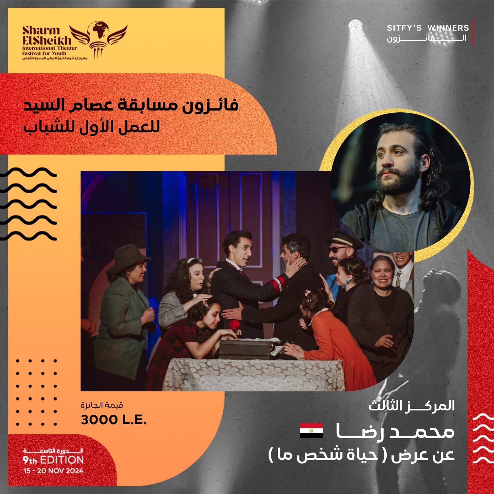 جائزة العمل الأول للشباب ( النسخة الثالثة ) : وهي جائزة مقدمة من المخرج الكبير عصام السيد وتحمل اسمه ، وتقدم تشجيعا لحركة المسرح الشبابي ودعما للمخرجين أصحاب التجارب الأولى وفاز بتلك المسابقة كل من : * المركز الأول : عادل مبروك بعرض "تريفوجا" * المركز الثاني : سعيد على سالمان بعرض "مرساة فى محيط هيستيرى" * المركز الثالث : محمود حسن جراتسي بعرض "دون كيشوت